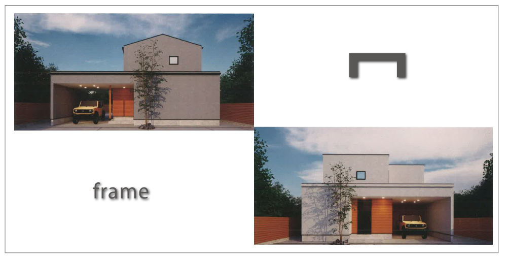 デザインを追求した建築家が考え抜いたスタイルの家。特に、外観フォルムに表現したframe(枠)は無駄のない美しさが感じられるよう設計された。また、このフレームのロゴマークには、鎹(かすがい)の意味も込められている。建築などで木材同士を繋ぎ合わせる際に使われるコの字型の釘のことであり、愛情をもって人と建築を強く繋ぎ止める意味も含めています。